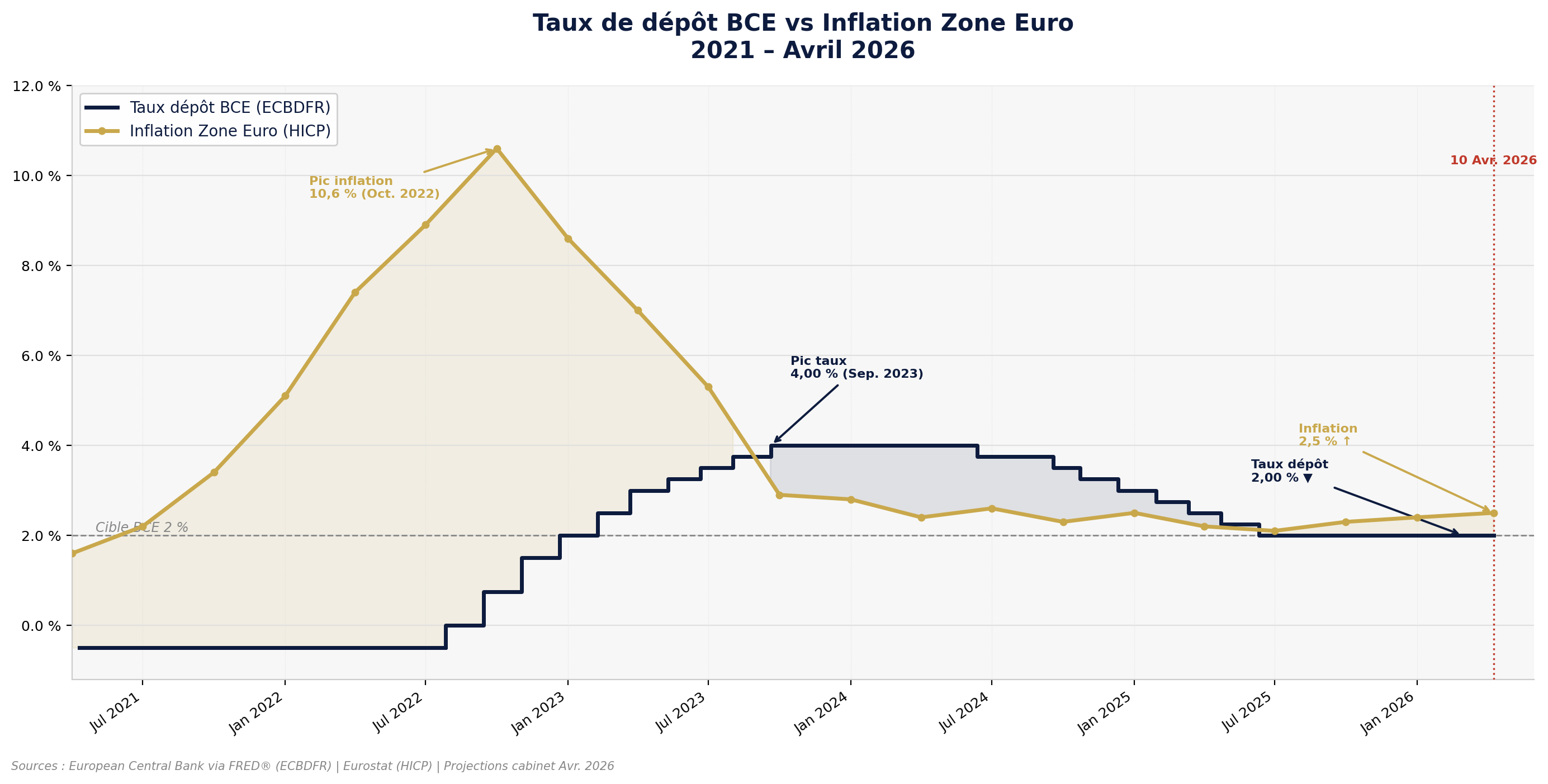 Figure 1 : Le ciseau 2021-2026. Notez le retour de l'inflation au-dessus du taux de dépôt en mars 2026, actant la fin du rendement réel sans risque.
